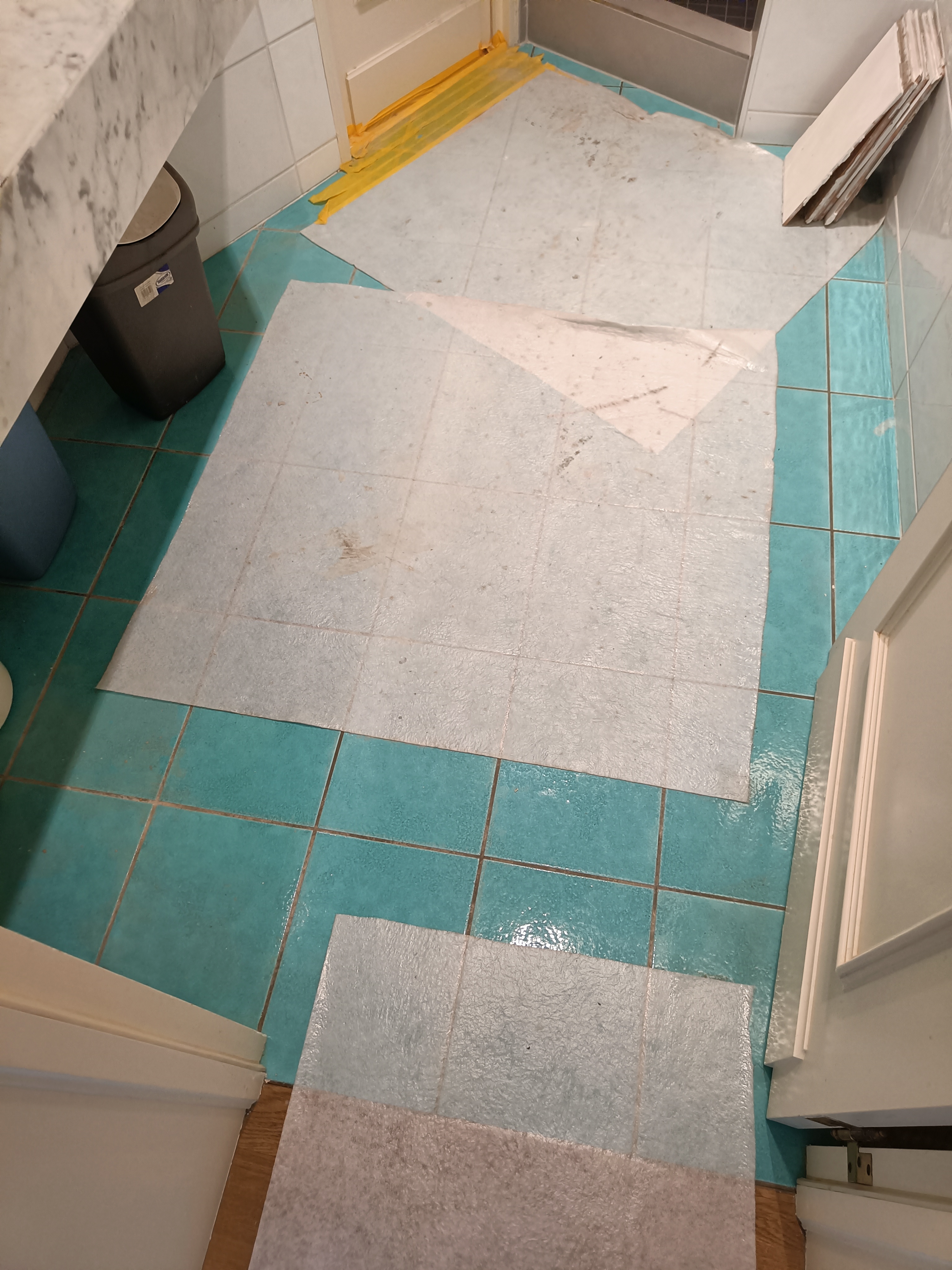 Remplacement dy carrelage existant du dol fe la salle de bain(vert) , par nouveau carrelage, environ 4 mères carrés.