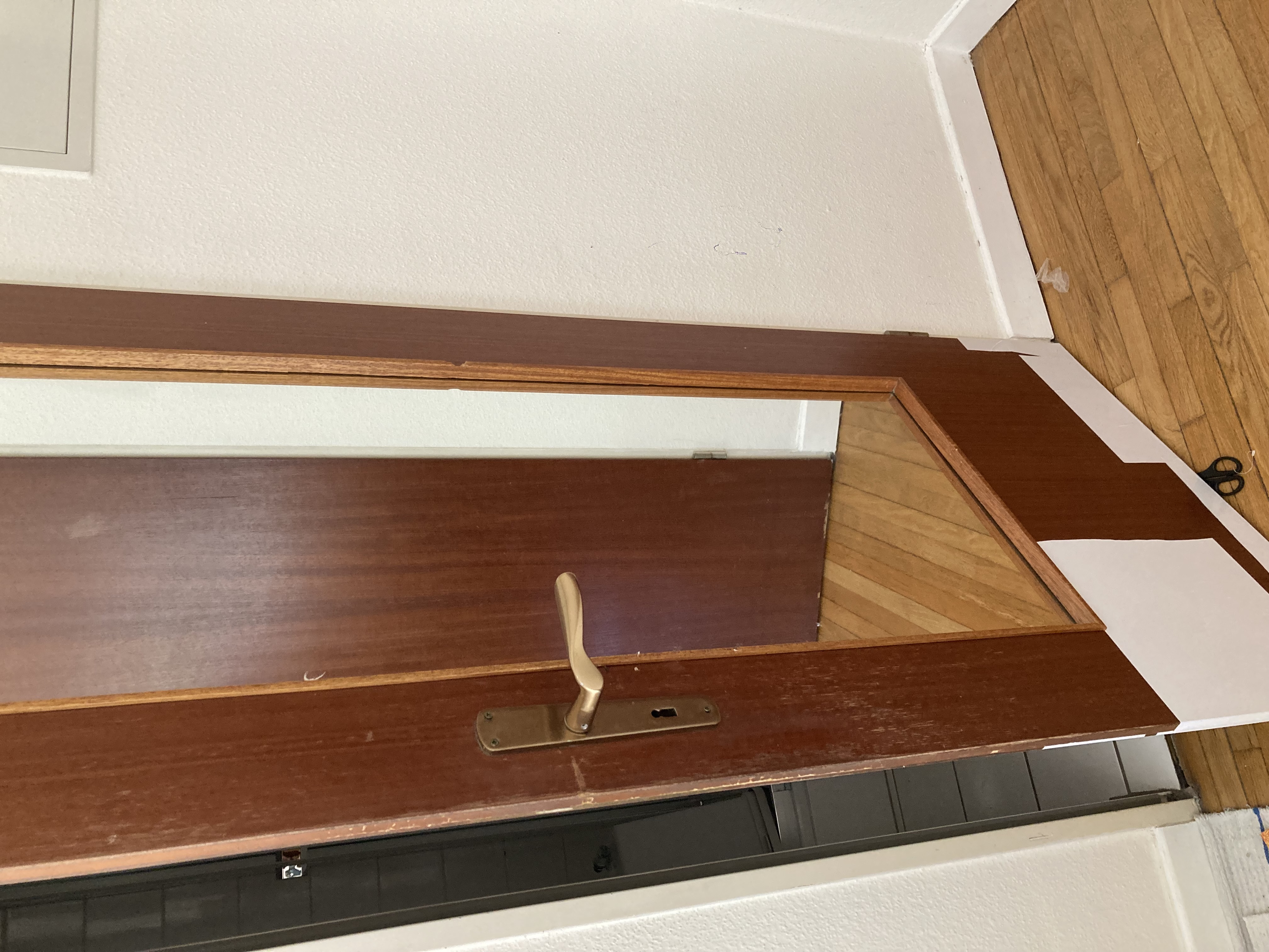 Demonter l’ancienne porte et instáller la nouvelle dans le même cadre (peut-etre déplacer les joints et le poignée). La porte mesure 73cm