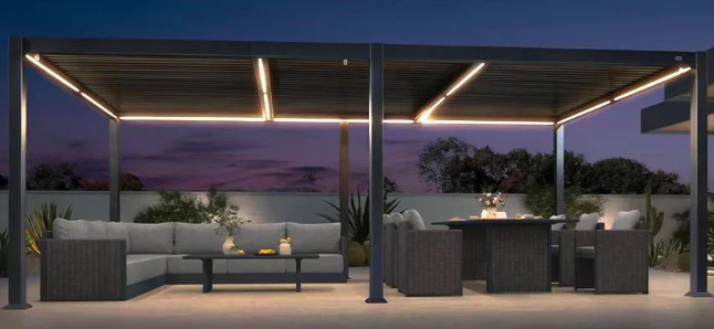 Nous souhaitons une pergola en aluminium à toit à lamelles avec bande lumineuse LED intégrée (type PURPLE LEAF ou modèle équivalent), afin de profiter d’un espace ombragé en été avec nos enfants.