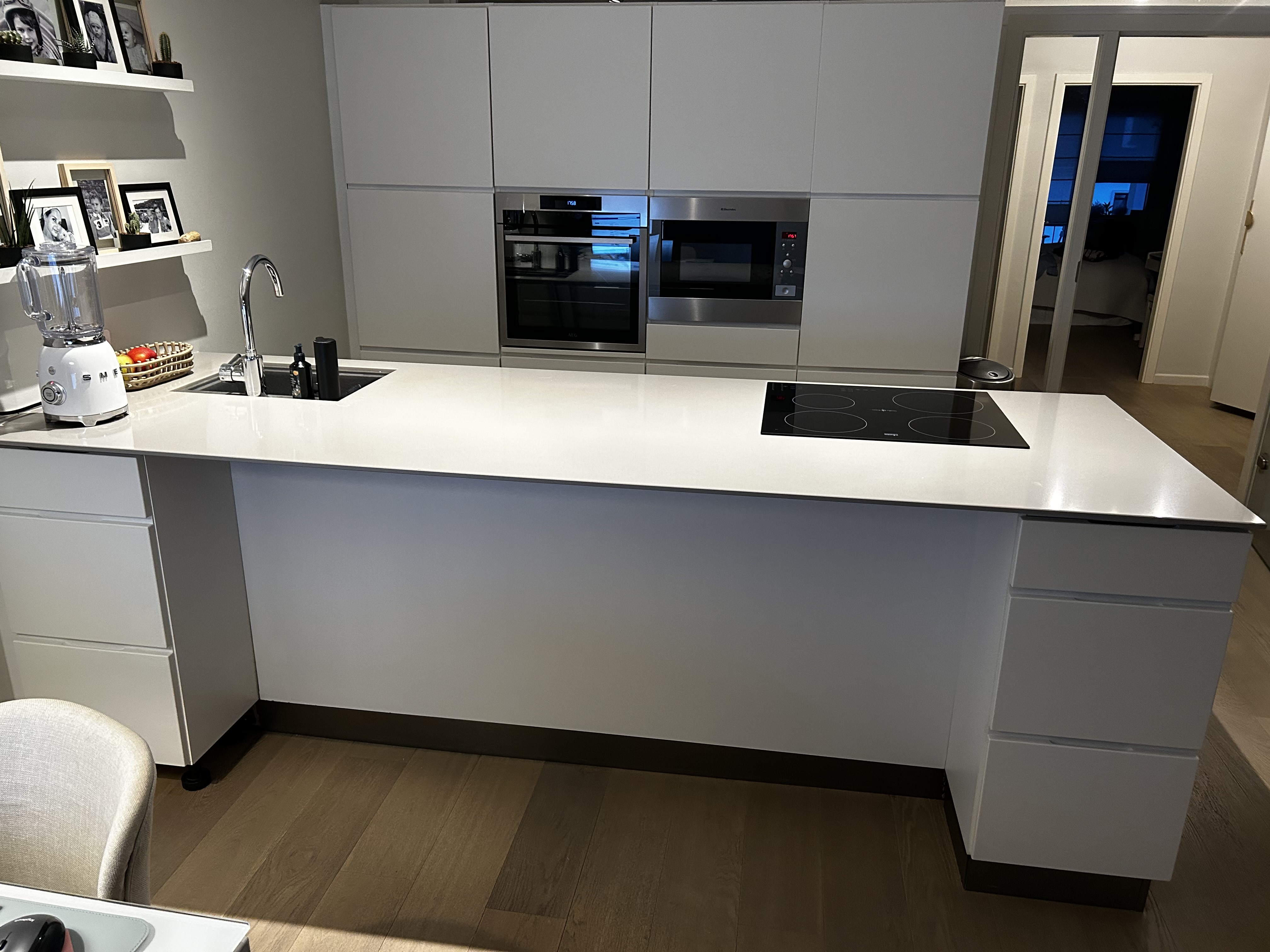 Creation de meubles sur mesure sous un ılot de cuisine, deux meubles d’environ 90 de large, 30 de profondeur et 80 de hauteur, un meuble de 90 de large, 30 de profondeur et 60 de hauteur les deux en melaminé blanc + deux casiers en bois (type chène clair ) de 20 de hauteur et 45 de largeur