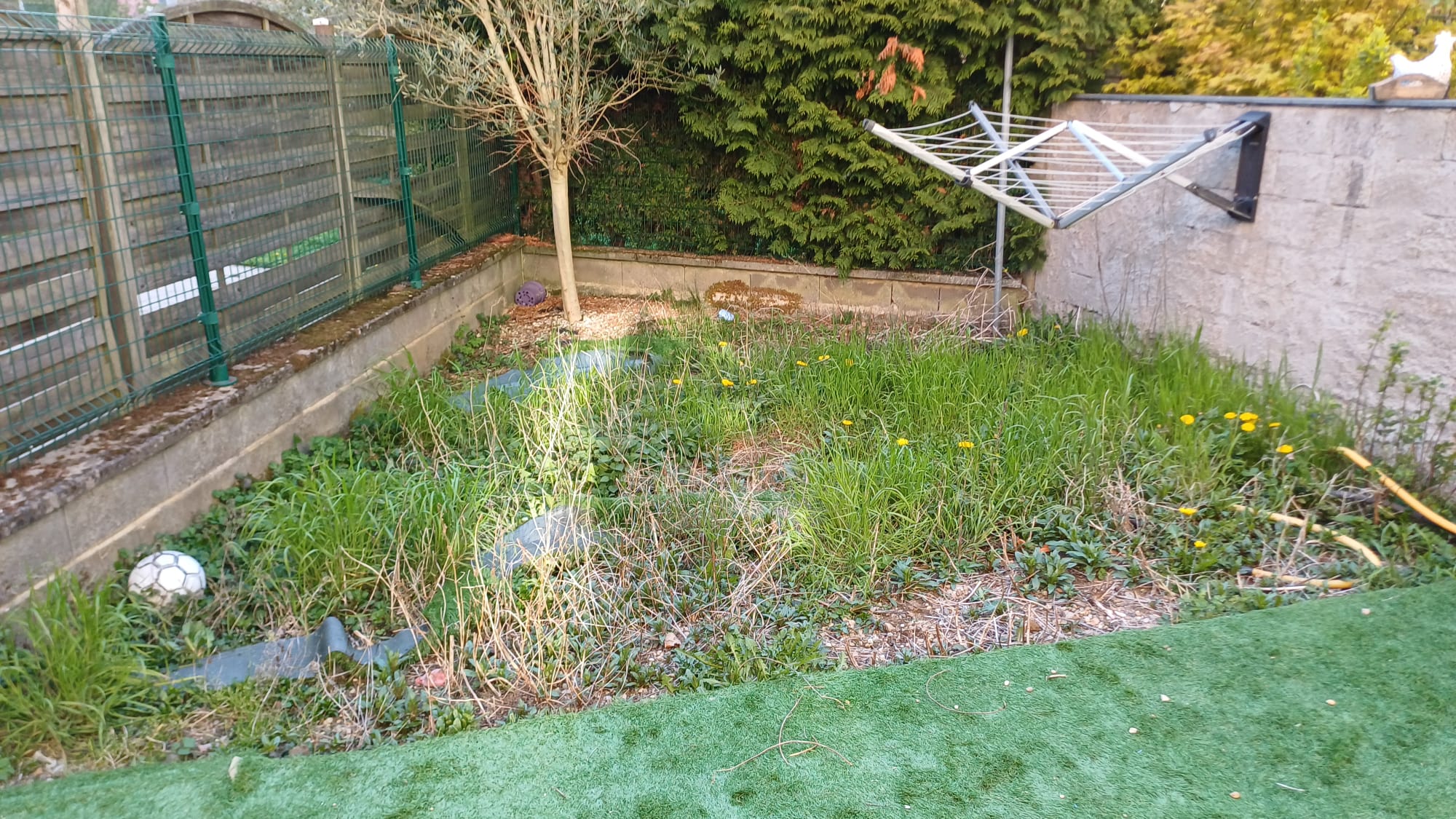 Nous aimerions poser du gazon synthétique sur la 2e partie de notre jardin. Il y a pleins de mauvaises herbes et de petits cailloux, ainsi qu'un barre de ferraille qu'il faut couper que nous avons trouvé là (je pense que les anciens propriétaires voulaient couler du béton et n'ont pas fait tout le jardin).