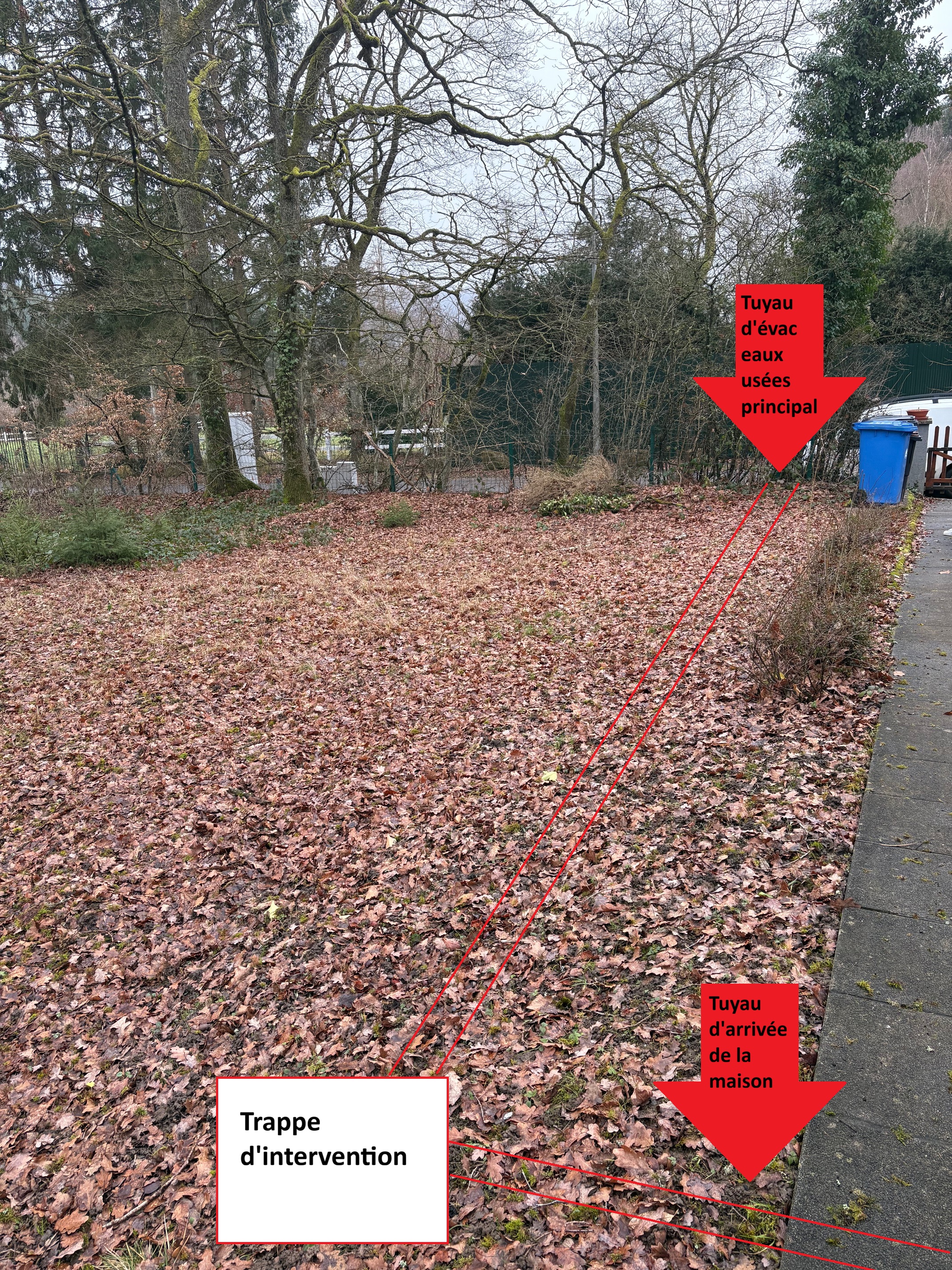 Remplacement d'un tuyau d'évacuation des eaux usées (cassé): - ouverture d'une tranchée sur 10-15m - enlèvement du tuyau cassé - éventuellement renforcement de la tranchée - installation d'un nouveau tuyau d'évacuation - remblayage.