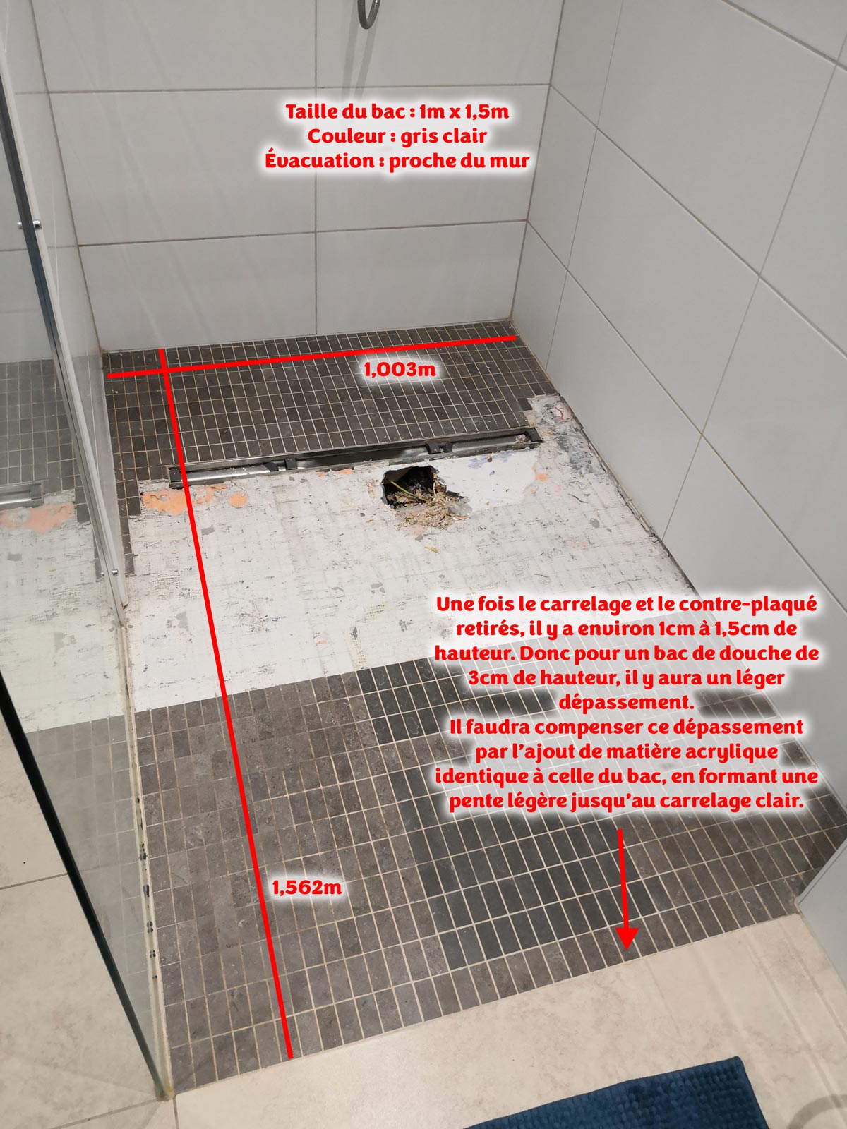 Le devis doit inclure le temps pour retirer le sol existant (carrelage + contreplaqué), la pose du bac (raccordement à l'écoulement et à la terre), les ajustements pour la vitre et le raccord avec le carrelage clair du reste de la pièce.
