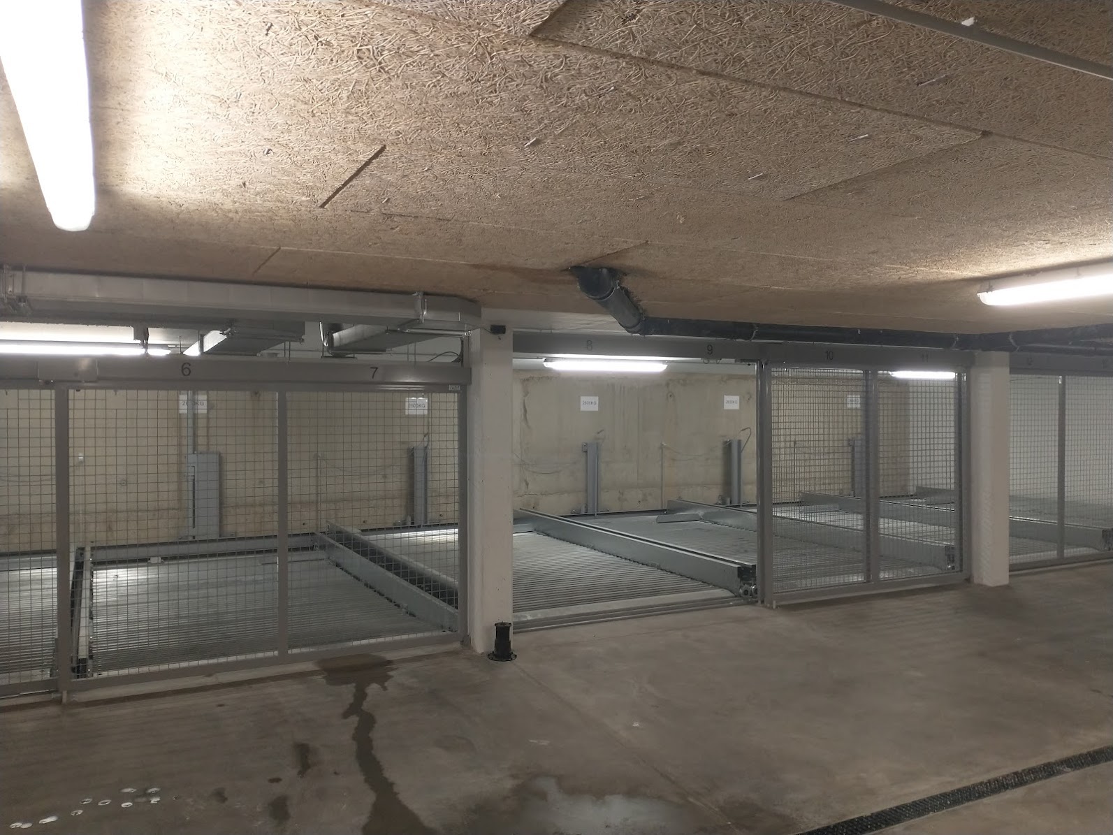Installation d'un système maître-esclave et 4 bornes sur un park lift de Swiss Park à 11 emplacements.