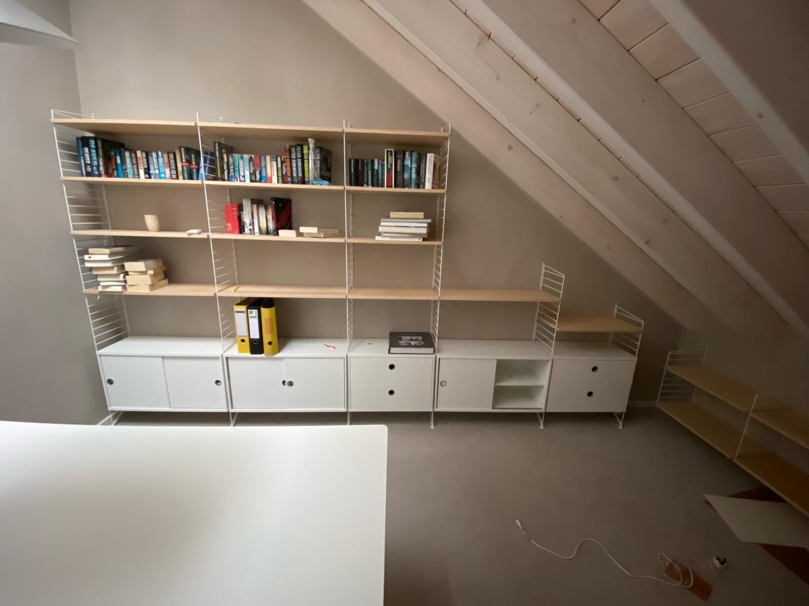 2 étagères de la marque String Furniture à fixer au mur suite à un déménagement. Il faudra d’abord fixer les barres verticales et ensuite clipser les tablettes / éléments tiroirs ou portes coulissantes (éléments déjà montés). Une étagère mesure approx 2m et l’autre approx 2.8m. La tablette large (bureau) de l'étagère 1 (voir photo E1) sera remplacée par 4 tablettes 'normales'. De l'étagère 2 (voir photo E2) la 2e colonne à partir de la droite ne sera pas à monter - il n'y aura donc que 4 colonnes de l'étagère 2 à monter (au lieu de 5).