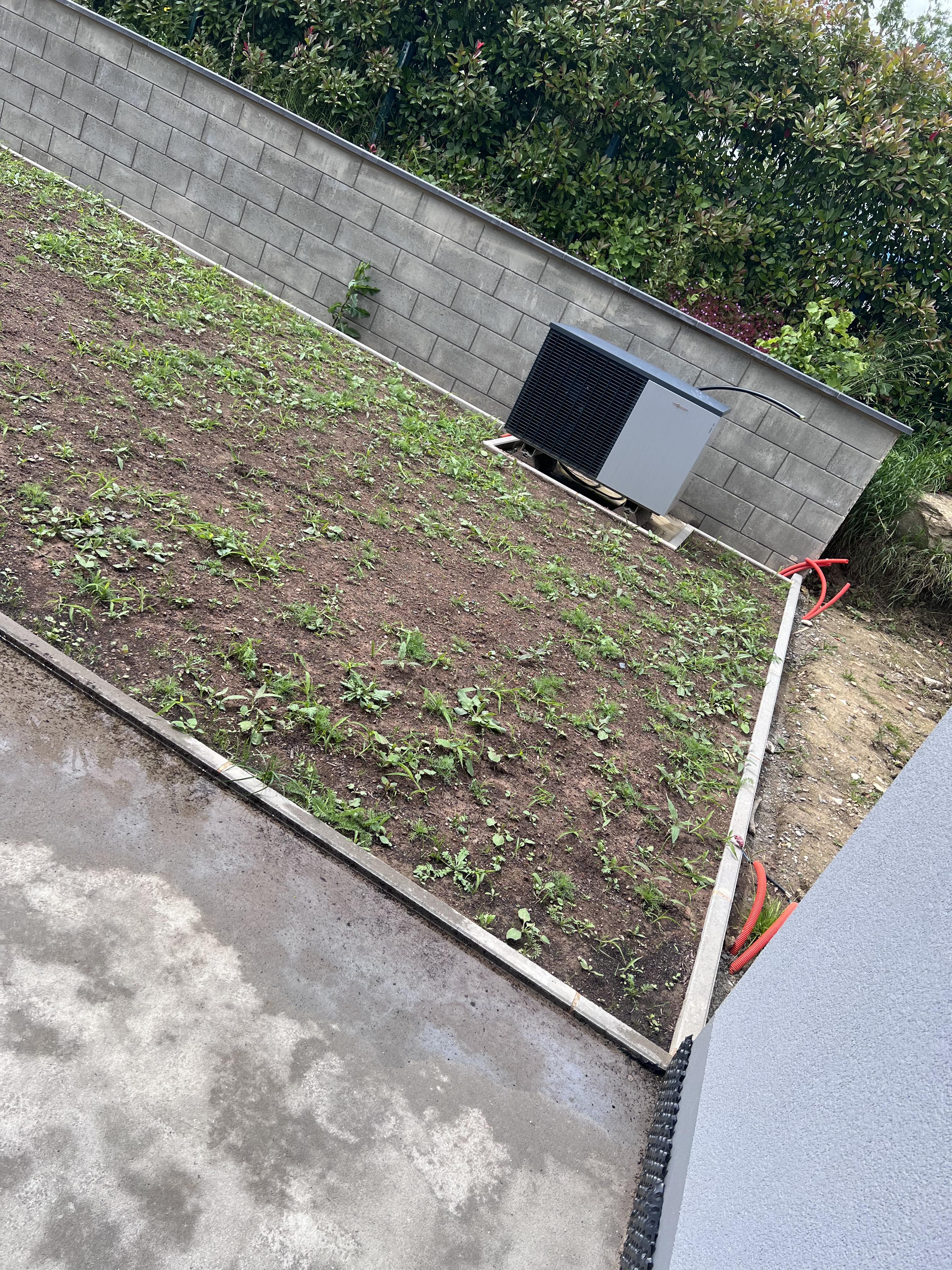 Retirer les mauvaises herbes, retourner la terre et semer du gazon résistant pour les chiens. 130m carré.