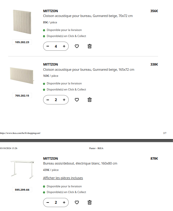 Montage de 5 meubles IKEA, 3 etages/bloc tiroir Alex + 2 bureaux Mittzon electriques et cloisons acoustiques correspondantes