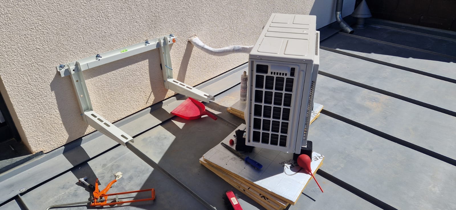 Actuellement notre unité extérieure de notre climatisation est installée sur une toiture. Accès facile à la toiture plate, hauteur une étage.