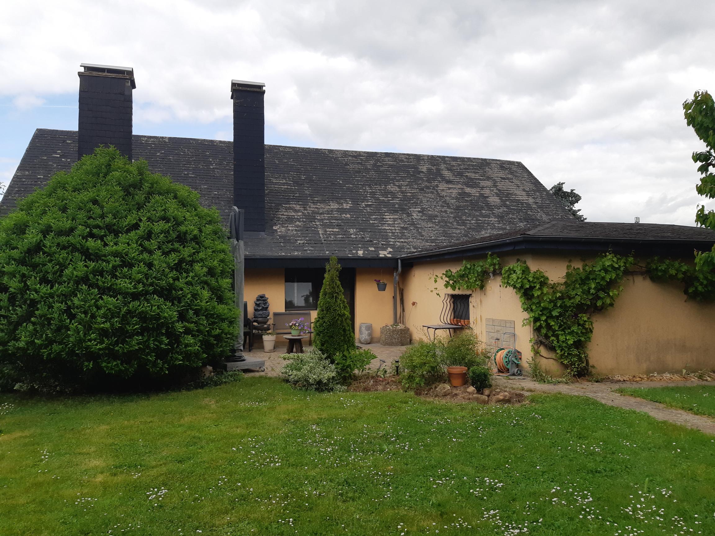 Remplacer une ancienne couverture de toiture en eternit d'une nouvelle en eternit ou en ardoise pour une maison unifamiliale, construite en 1984, et pour une garage, partiellement changer l'isolation de la toiture de la maison et installation de nouvelles gouttières et chêneaux de la maison.