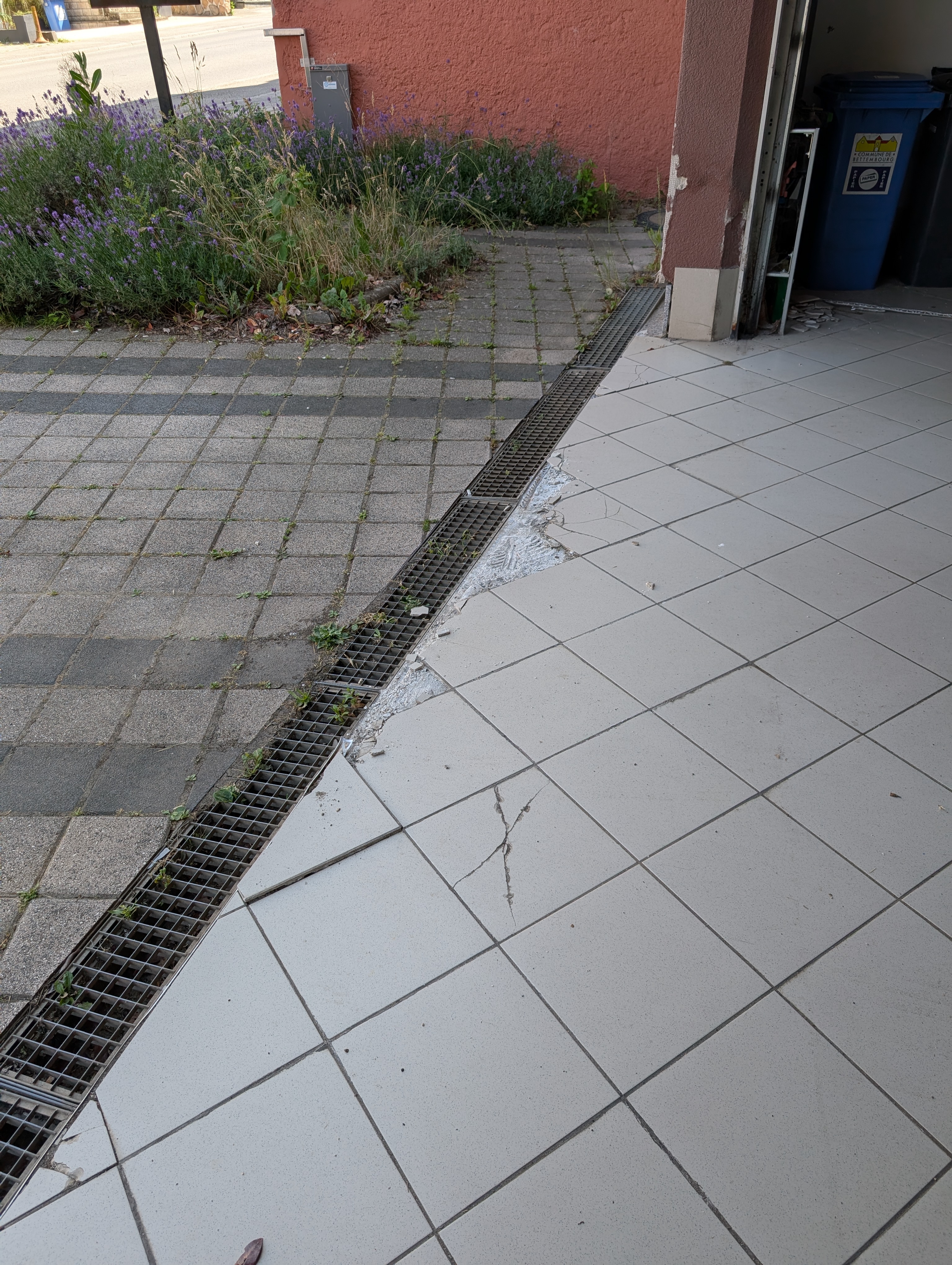 Remplacement carrelage (retrait et pause) - environ les 2 premières lignes de carrelage de l'entrée du garage car nouveau carrelage d'une autre couleur
