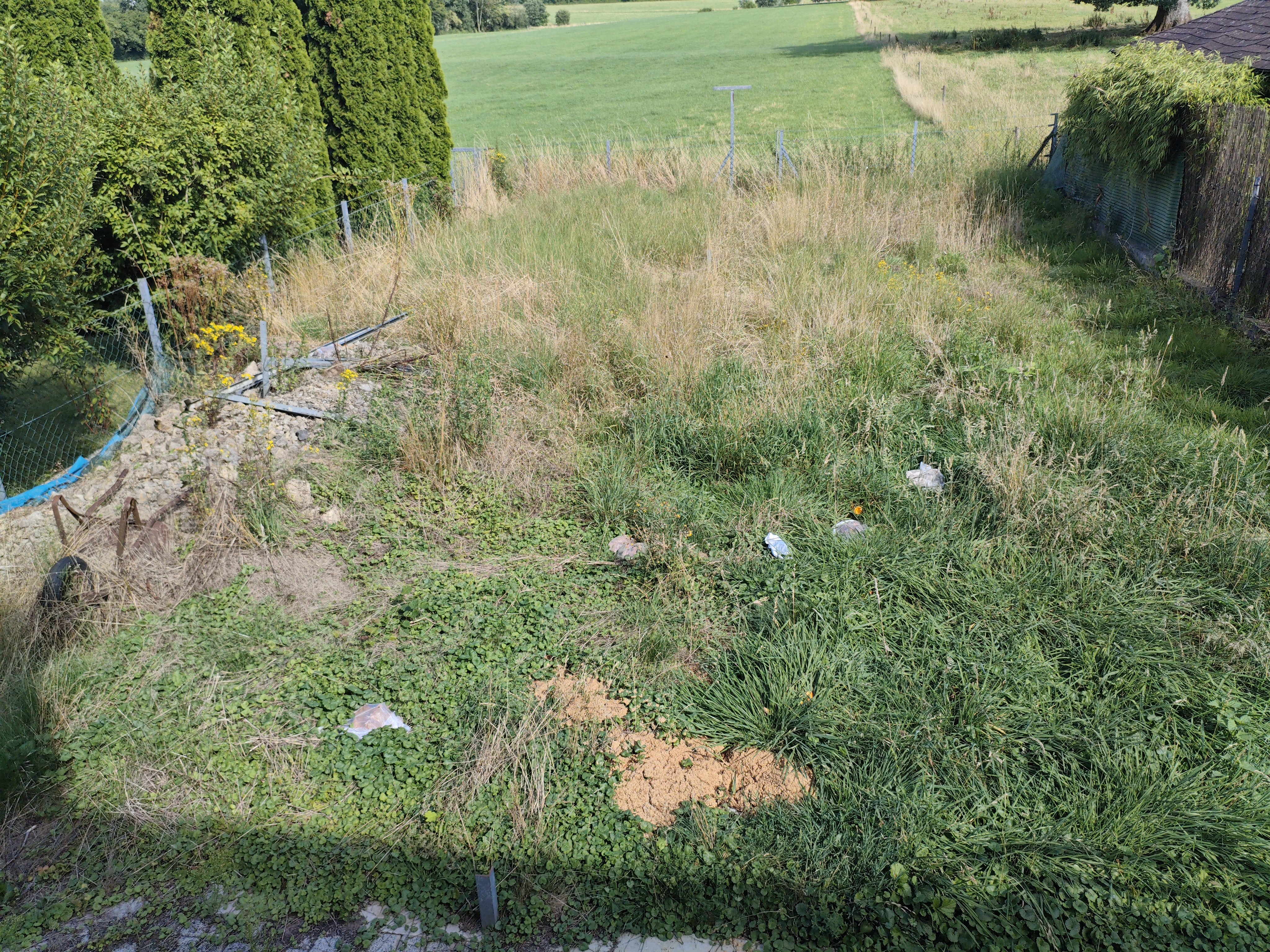 Déplacement pierres 3 M3 à enterrer dans le jardin, de remettre à niveau, et semer nouvelle pelouse.3.piqiets en métal à enlever du terrain. 1 découpe d'une piquet en métal.(Équerre fer).