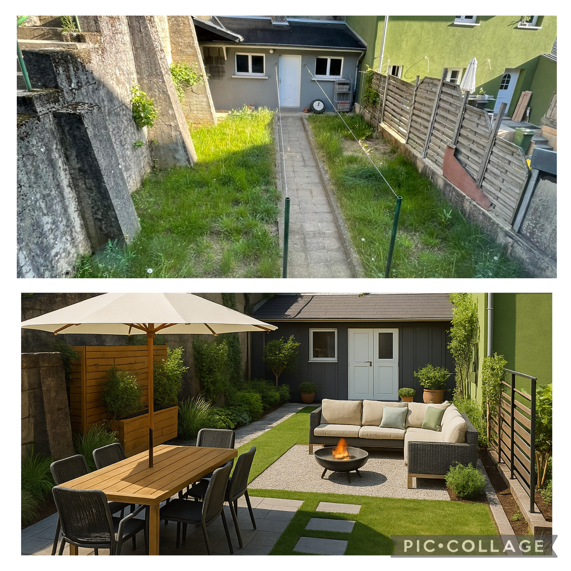Je voudrais réaménager mon jardin. 1ère photo=état actuel,2ème photo = idée d‘un projet réalisé. Puisqu‘on n‘atteint le jardin que par le garage,j‘aurai aimé la possibilité de construire un accès d‘escaliers depuis le premier étage.