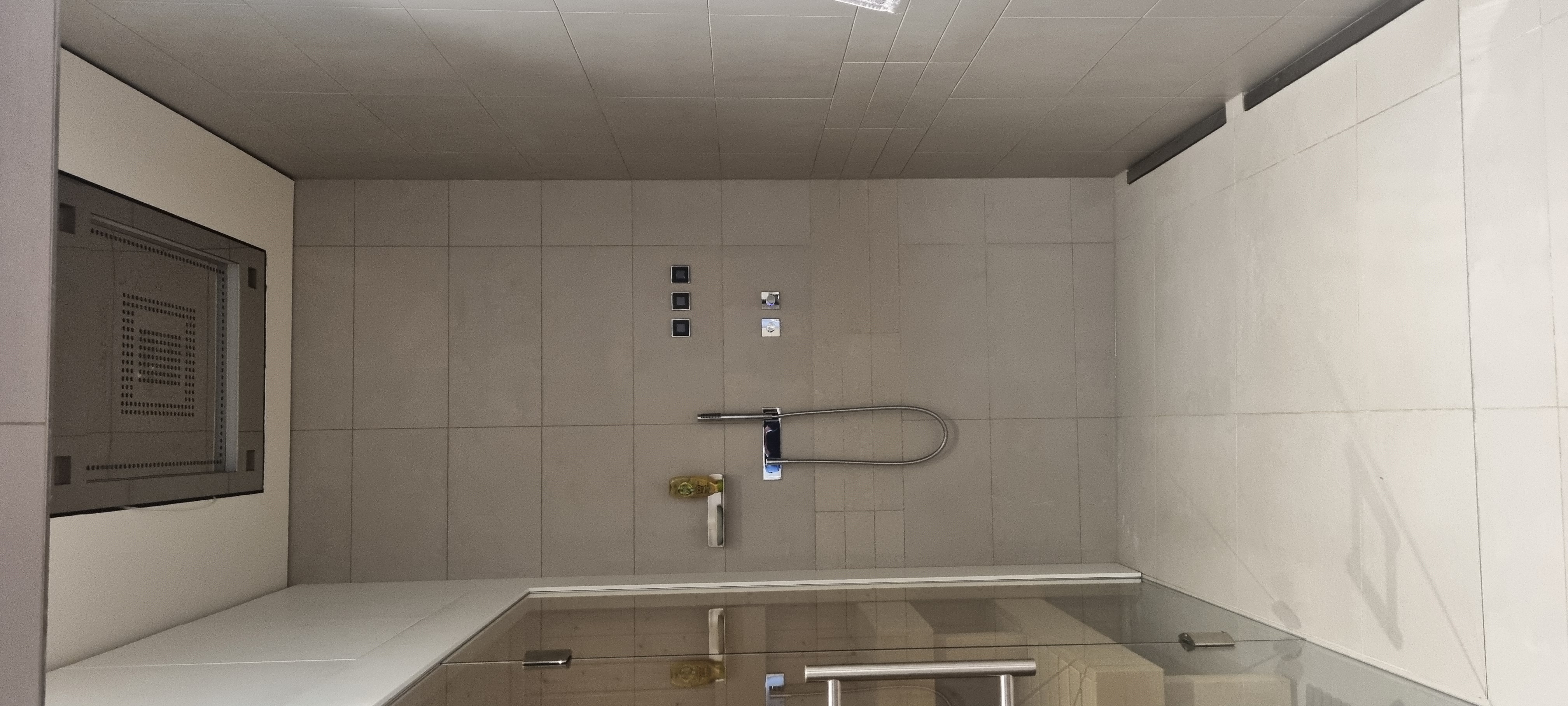 Changement d'une douche au plafond qui ne fonctionne pas très bien pour une colonne de douche simple. Quelques carreaux de carrelage à refaire car la douche est aujourd'hui intégrée. Photo de la douche actuelle attachée. Colonne de douche en acier brossé du genre Grohe Euphoria 260 ou 310