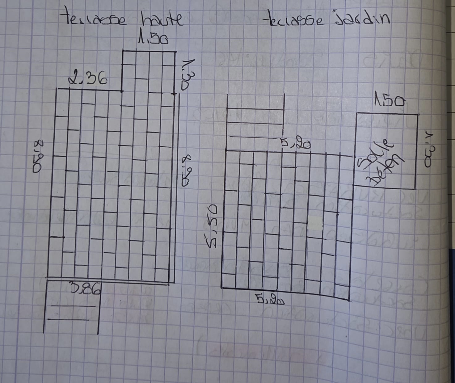 2- rénovation d’un terrace déjà existante, retirer les carreaux en ciment et mettre composite imitation bois. Cette terrace est en hauteur il faudra aussi renforcer les latérales avec du béton… toute autour de la terrace nous avons une haie (brise-vue)