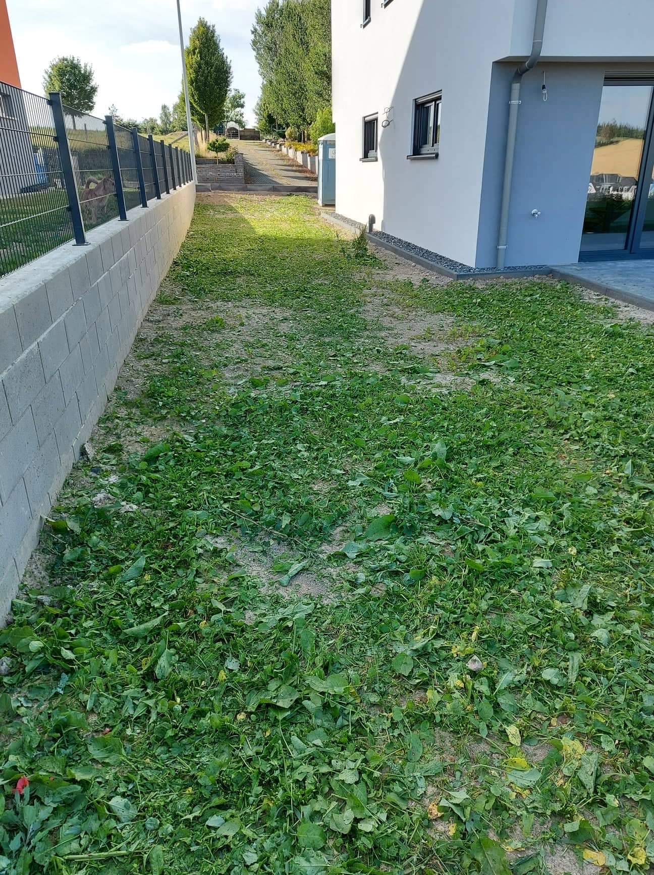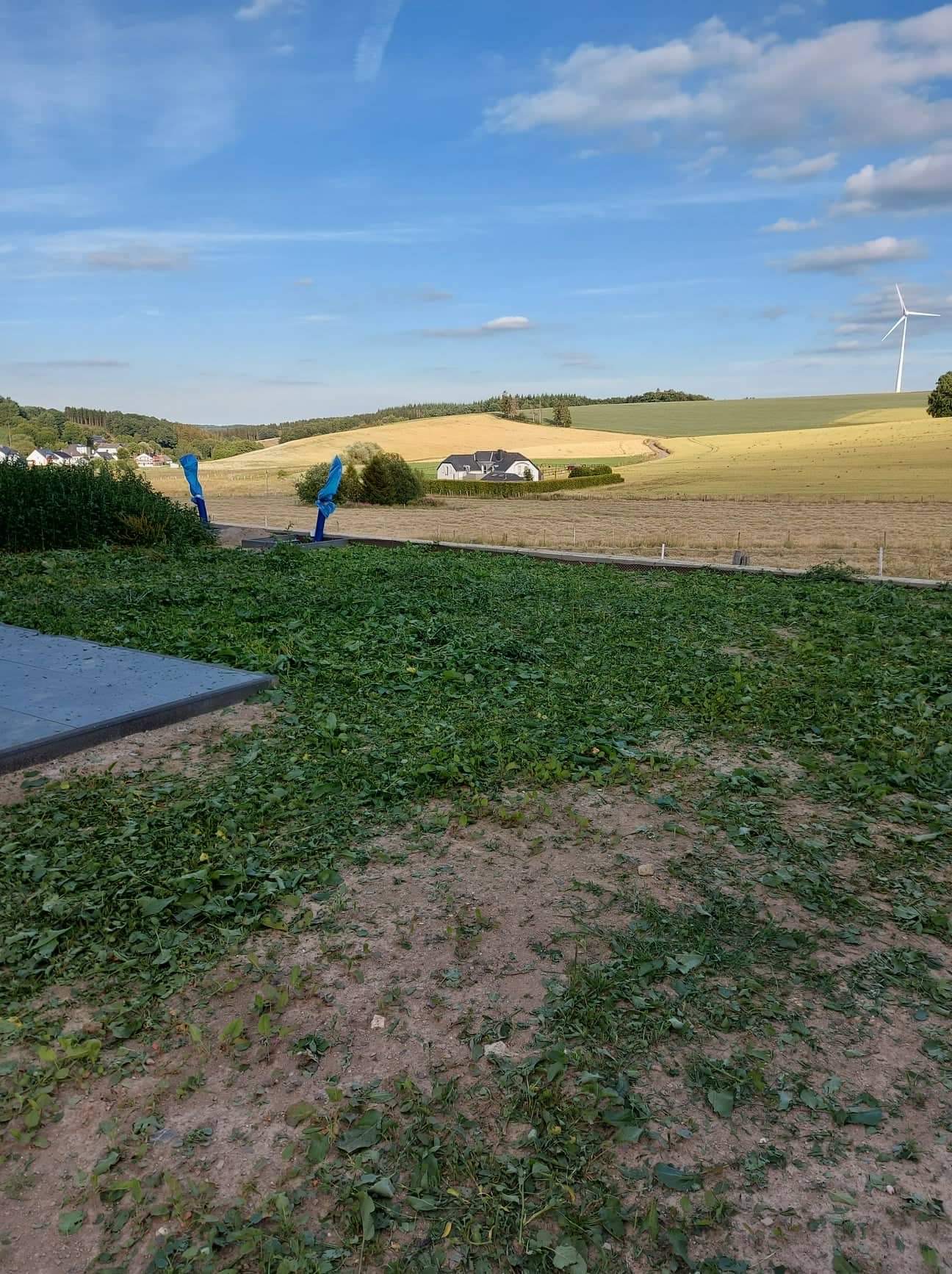 fourniture de terre vegetale (15m3), pose de 20m de cloture (200x120), engazonnement (105m2)