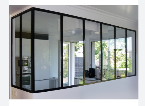 cloison en verre de séparation (270x270) entre une chambre et un salon avec une porte coulissante se prolongeant en angle droit (200x170) dans l'entrée de l'appartement, la partie basse dans l'entrée étant constituée d'un muret d'un mètre sur 2 mètres.