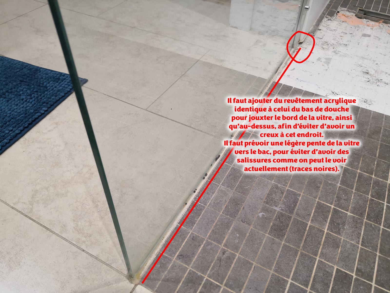 Le devis doit inclure le temps pour retirer le sol existant (carrelage + contreplaqué), la pose du bac (raccordement à l'écoulement et à la terre), les ajustements pour la vitre et le raccord avec le carrelage clair du reste de la pièce.