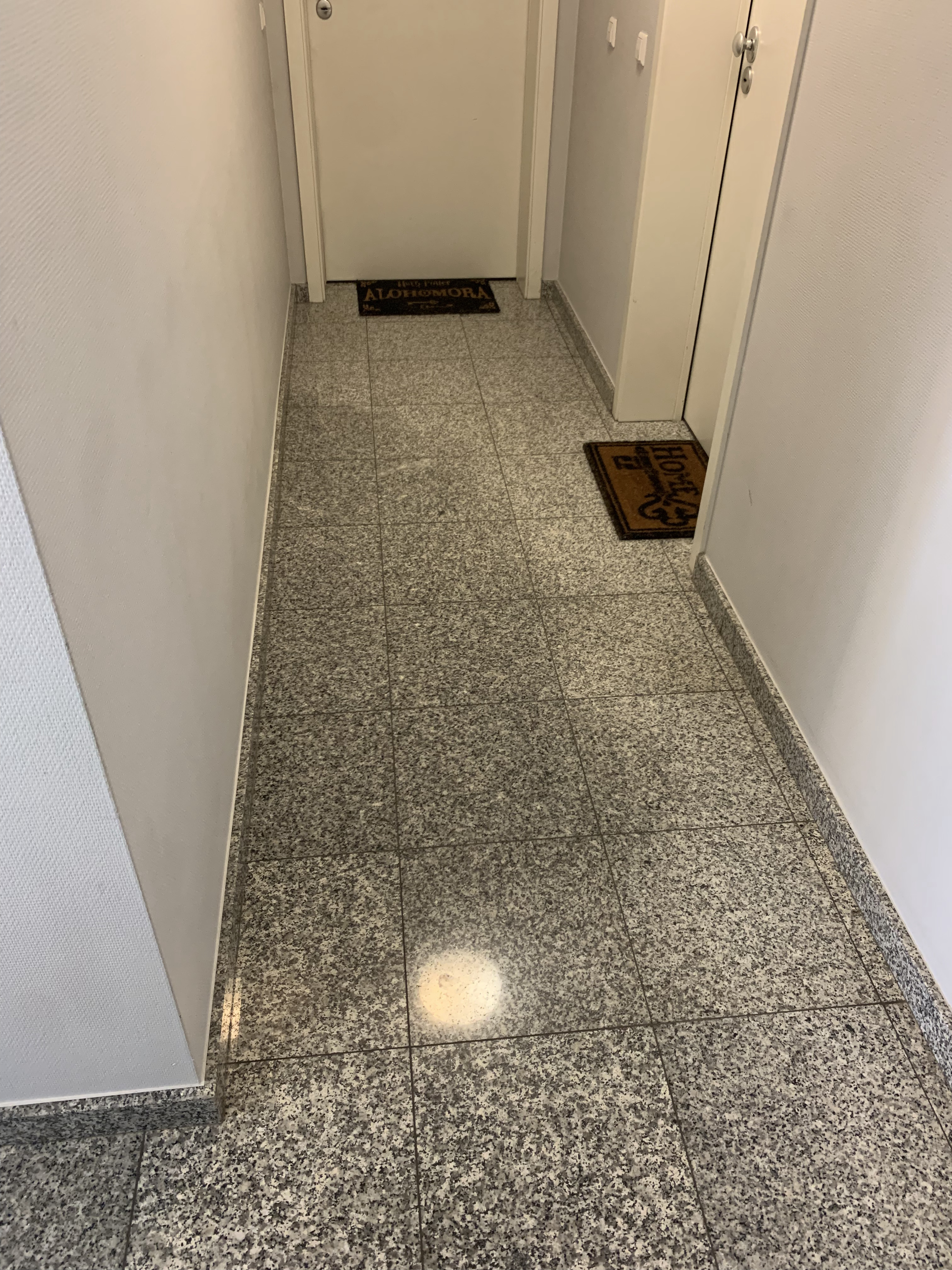 Même dans le couloir (partie commune) on voit que le carrelage a pris une autre couleur puisqu'il ya l'eau en dessous.