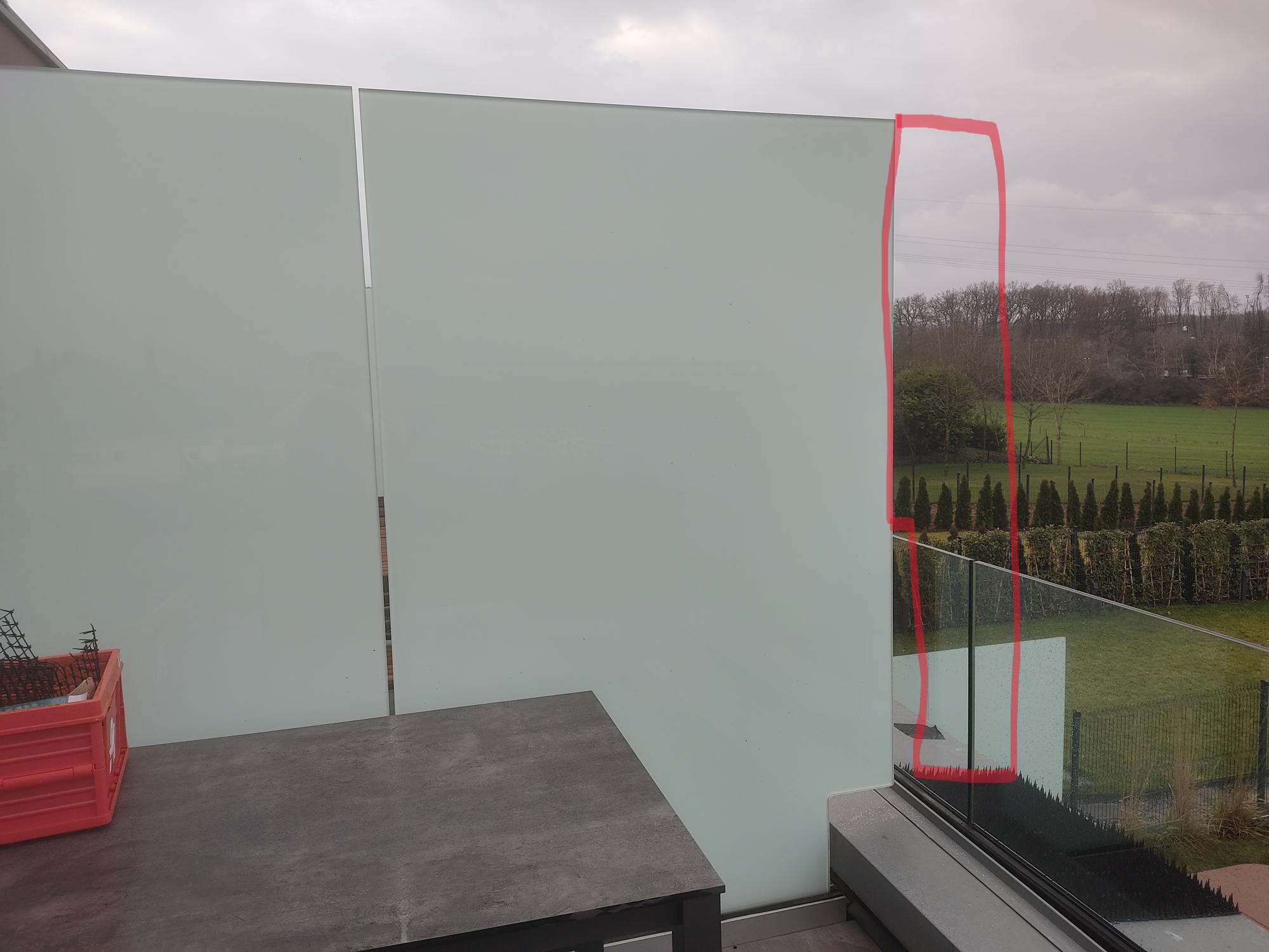 Nous voudrions qu'il puisse sortir sur la terrasse mais qu'un brise vue additionnel / panneau de verre (ou un autre système) soit installé afin qu'il ne puisse plus aller chez les voisins en utilisant le parapet.