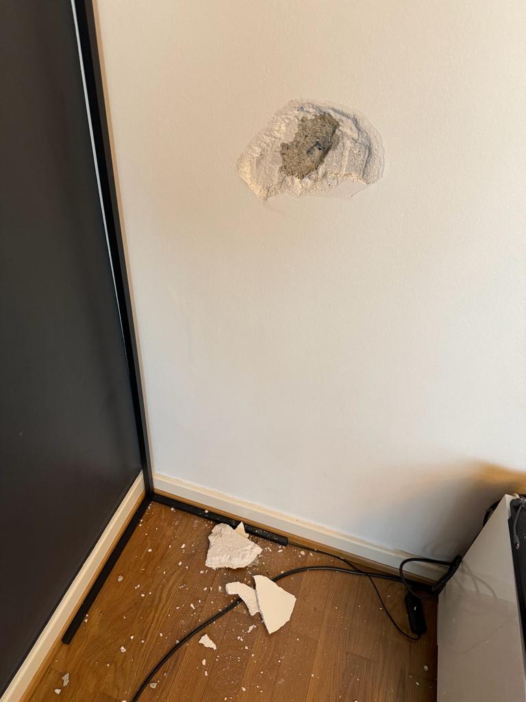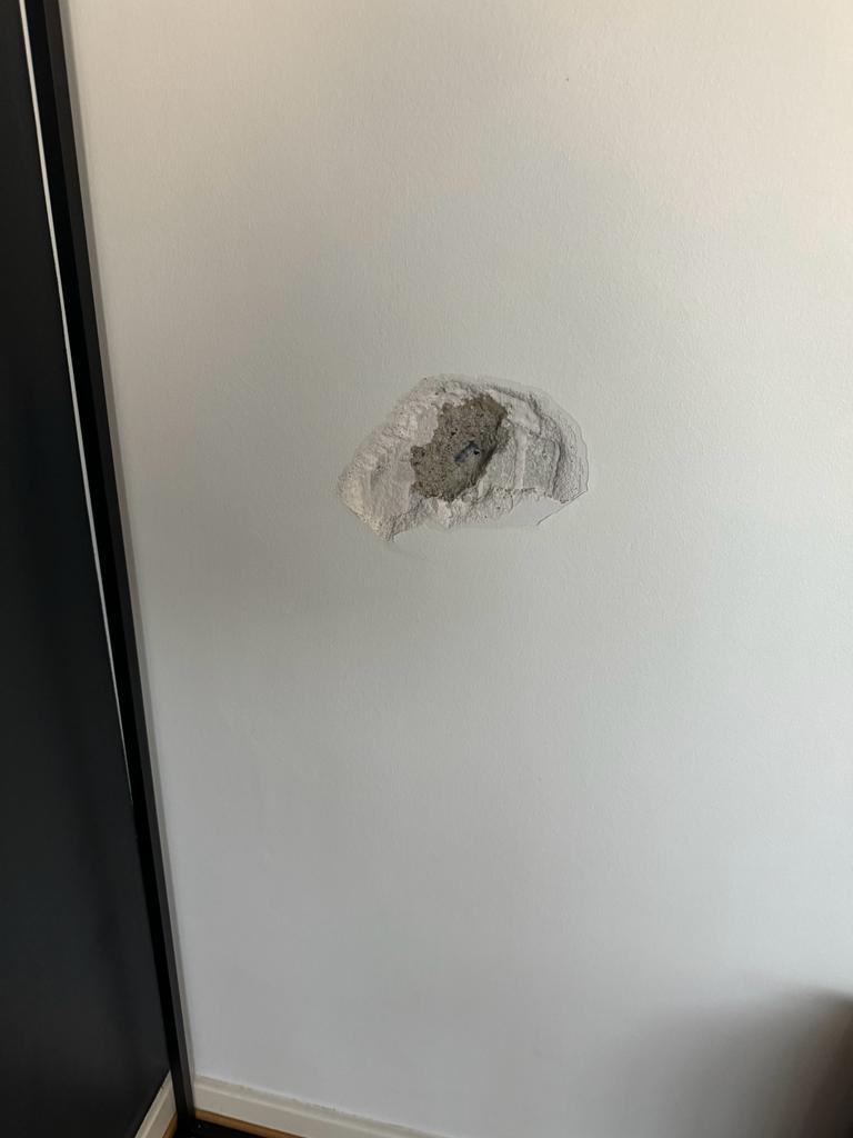 Suite à un perçage raté je dois faire refaire un mur chez un client. Il faut ré enduire le trou et repeindre le mur.