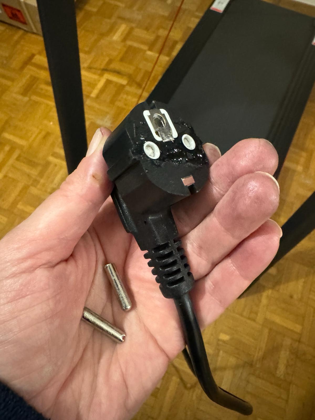 1) Je viens d'acheter le tapis de course. Je l'ai installé, et quand j'étais prêt à m'entraîner pour la première fois, quand j'ai retiré la fiche de la prise, les deux broches se sont cassées. J'ai essayé de les recoller, mais cela n'a servi à rien. Je voudrais changer la prise du tapis roulant.
