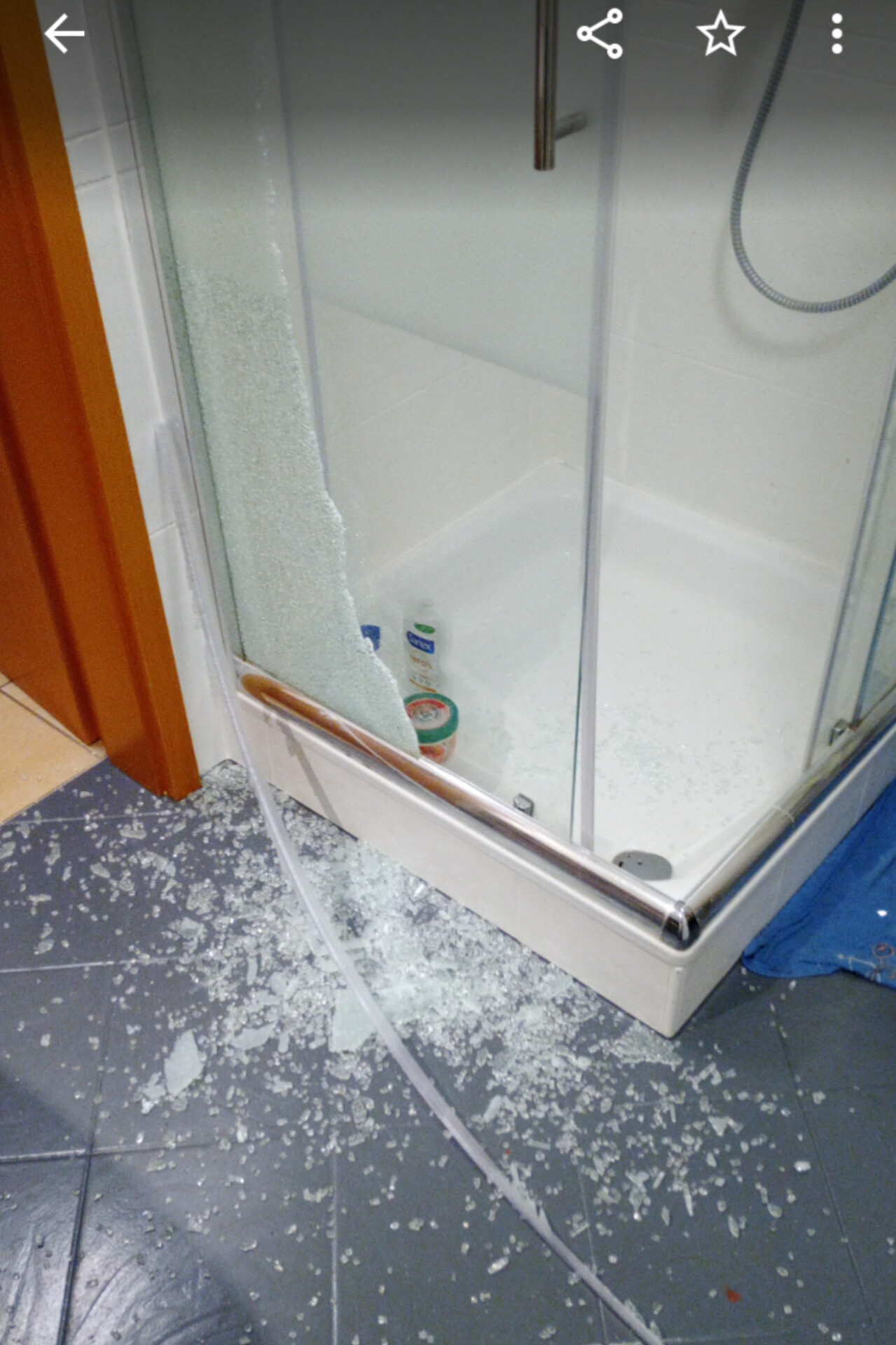 Veuillez trouver en annexe les photos de ma douche. La vitre de ma douche a explosé ... je crois que c'est à cause d'une malfabrication sinon je ne vois pas d'autres explications. Je n''étais pas là au moment oÙ c'est arrivé.